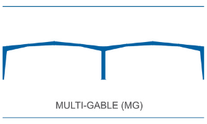 MULTI GABLE (MG) – This type of frame is the used in case of wide shed but are more economical than the Multi Span frame type. It is lighter because the trusses are smaller hence economical but it comes with a rider that it may has a water discharge in the center of the shed which would require an internal drainage line, which is not preferred in most of the industries where water ingress during unplanned excess rains lead to losses.