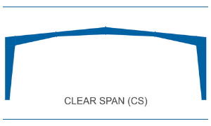 CLEAR SPAN (CS) – This type of frame is the most preferred and widely used worldwide. It offer clear access to loading and stacking function within the shed. As the pillars or columns are coming at both ends, it gives a very spacious and airy look to the entire shed. We can design these sheds for a width of upto 150 meters. However the water discharge from these types of frames is on both sides of the shed as this is a TWO SLOPE frame.
